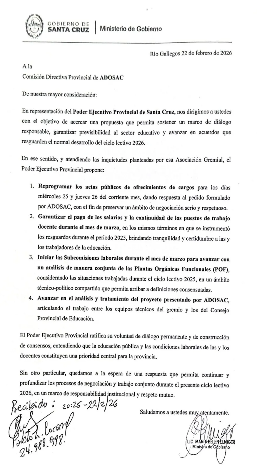 El Gobierno de Santa Cruz, mediante el Ministerio de Gobierno, elevó una propuesta formal a la Comisión Directiva Provincial de ADOSAC con el objetivo de sostener un marco de diálogo responsable y garantizar el normal desarrollo del ciclo lectivo 2026.