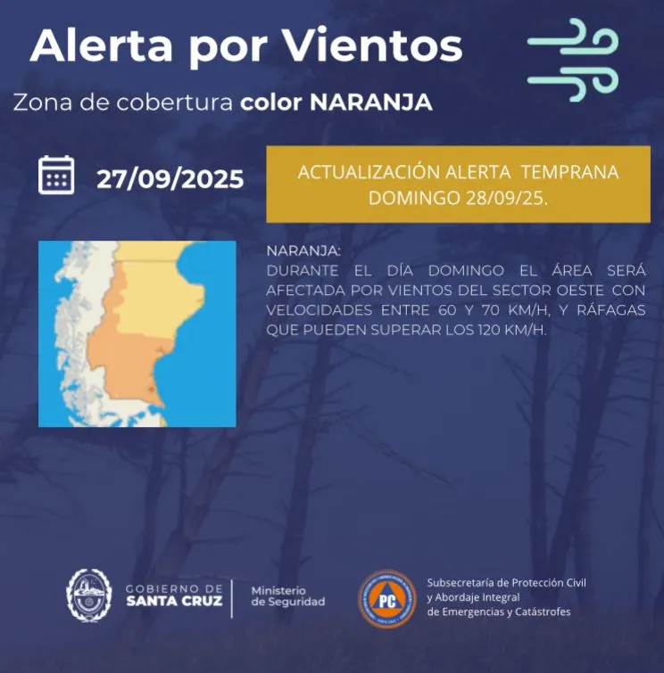 El Gobierno de Santa Cruz activó una alerta naranja por fuertes vientos que afectarán la provincia este domingo 28 de septiembre. Se recomienda a la población extremar precauciones, evitar trabajos en altura y circular con cuidado, especialmente en rutas y zonas urbanas.