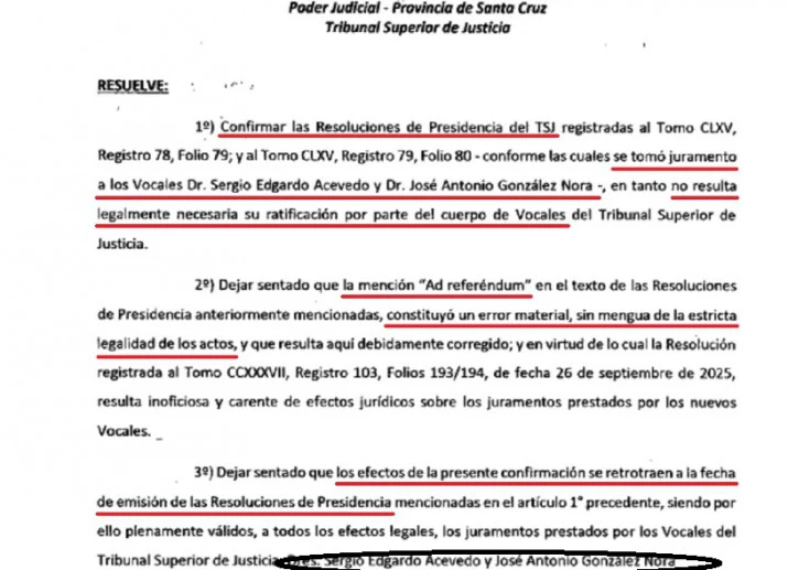 Así, declaró que: "Los juramentos son plenamente válidos desde su fecha original (26/09/2025)"; "la mención "ad referendum" carece de efectos jurídicos"; "El error no afectó la legalidad de los actos, ya que el presidente actuó dentro de sus atribuciones".El texto cita como precedente el juramento de la vocal Dra. Reneé Fernández, efectuado por la entonces presidenta Dra. Paula Ludueña en el año 2018, "donde también se usó la fórmula sin que el pleno interviniera", dice.