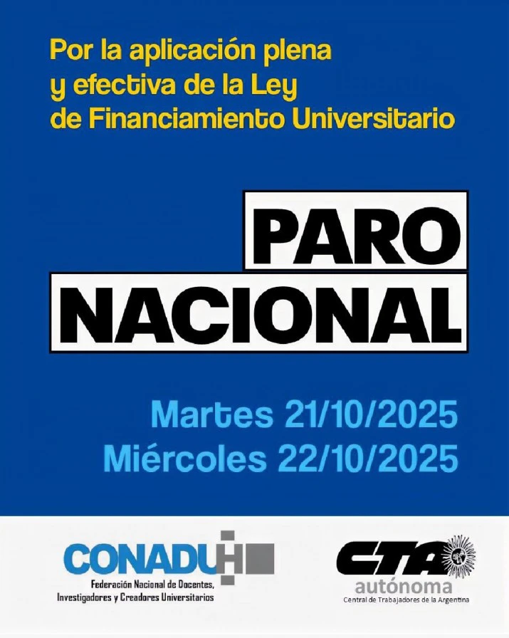 La Federación Nacional de Docentes, Investigadores y Creadores Universitarios (CONADU Histórica) y la Federación Argentina del Trabajador de las Universidades Nacionales (FATUN) anunciaron medidas de fuerza para este 21 y 22 de octubre. Reclaman la aplicación plena de la Ley de Financiamiento Universitario, aprobada por el Congreso y rechazada por el presidente Javier Milei, quien se negó a promulgarla.